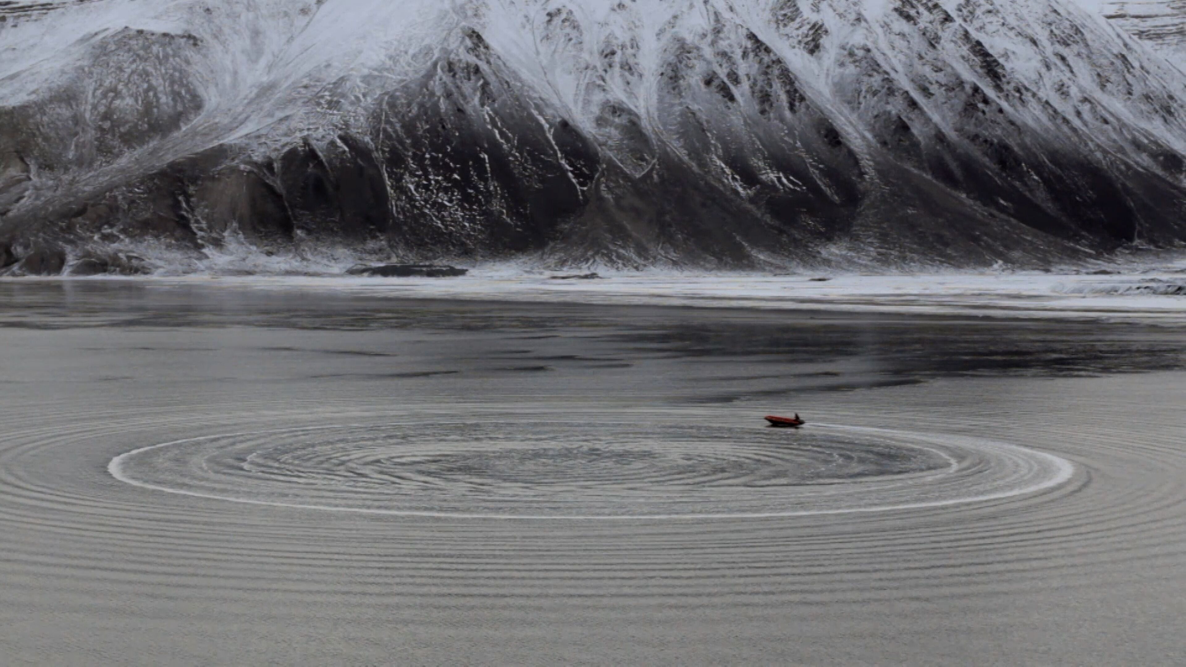 Gleichzeitig evoziert das Video Bezüge zur Land Art und hier im Besonderen zu Robert Smithsons Spiral Jetty, fügt dem Ganzen aber durch die Einblendung des Funkverkehrs auf der Tonebene eine ironische Note hinzu, die dem Sujet seine potenzielle Schwere nimmt. Erhabenheit und Stille der Landschaft werden entmystifiziert, wenn wir dem Regisseur und Fahrer des Bootes dabei zuhören, wie sie gemeinsam versuchen, die Spirale auf die Oberfläche des Meeres zu zeichnen, möglichst genau in die Mitte des vorher kadrierten Bildes. Und während die geometrische Einschreibung in „Spiral Jetty“ aus Stein erschaffen und ihre mitgedachte Erosion auf Jahrzehnte angelegt ist, bedient sich Reign of Silence einer ungleich flüchtigeren und damit transitorischen Geste, deren Spur sich im Moment ihrer Realisierung bereits wieder verliert.